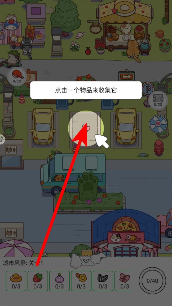 1、进入关卡后,会看到点击一个物品来收集它的提示,根据提示点击场景中对应的物品,开始收集任务,逐步积累收集到的物品数量。