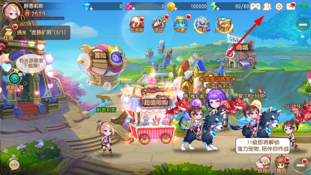 1、打开弹弹岛游戏,进入主界面后点击界面右上角好友的图标进入社交相关页面。