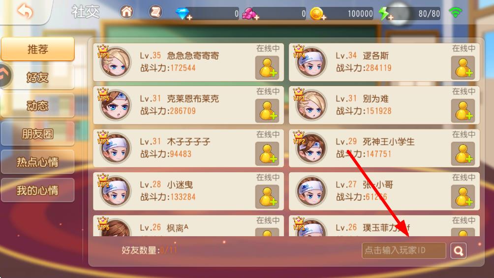 2、在社交页面中找到并点击下方点击输入玩家ID的输入框,输入你想要添加好友的玩家ID再点击旁边的搜索按钮。