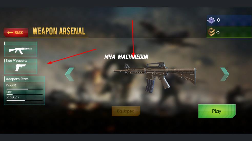 1、进入武器库界面,可选择M4A机枪等主武器,也能搭配副武器,查看武器伤害、后坐力、精准度等属性,点击Play开启游戏。