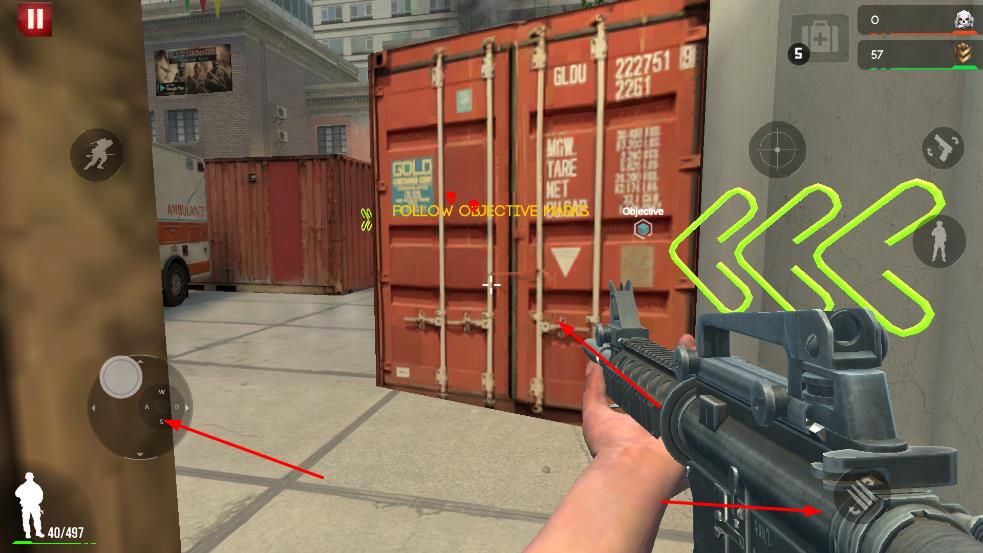 2、在战斗场景中,通过左侧摇杆操控移动,跟随目标标记推进,遇到敌人时点击射击按钮发起攻击,灵活调整射击角度。