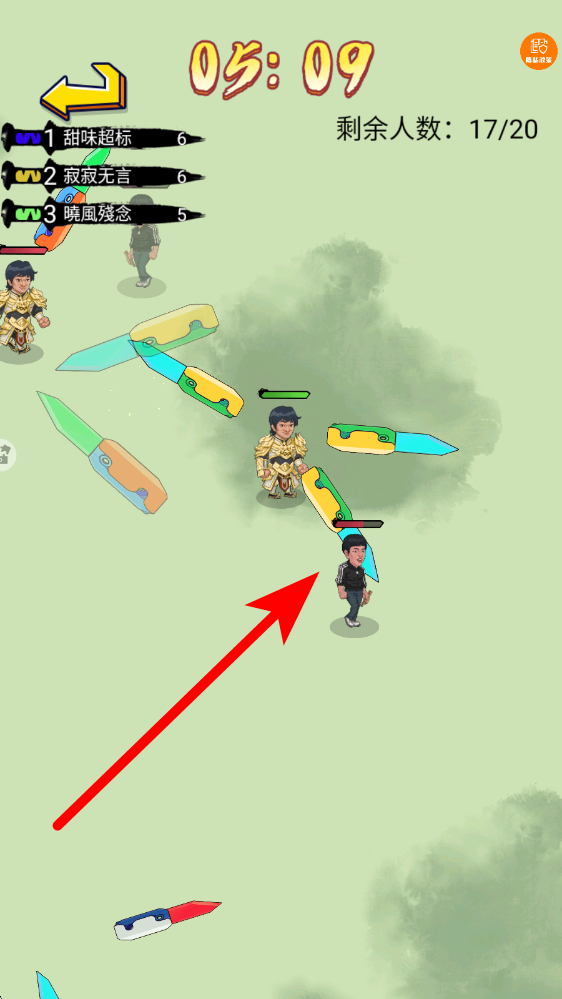 3、操控角色移动,利用萝卜刀等道具,瞄准对手进行攻击,在有限时间内,尽可能击败更多对手,提升自己的排名,获取对战胜利的成就感。