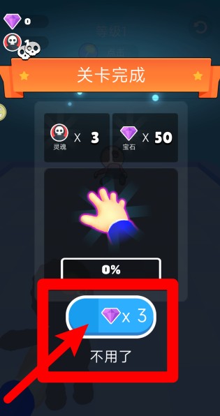 3.关卡完成:结算面板展示奖励明细,可选择点击蓝色按钮领取三倍钻石,或点选不用了直接退出继续下一关挑战。