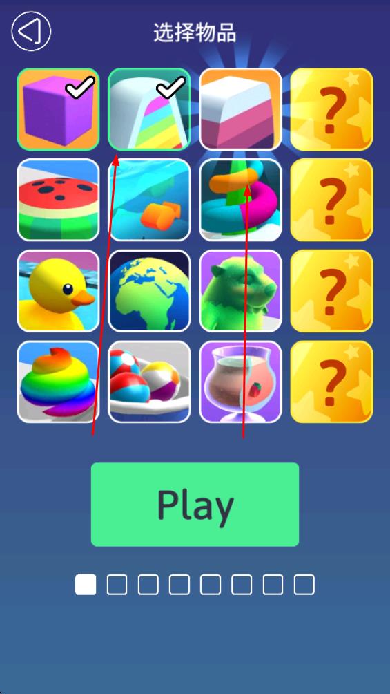 2、在选择物品界面,挑选想要加工的物品如彩色方块等,点击Play按钮开启对应关卡。