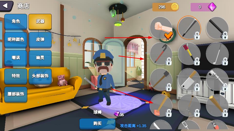 3、进入商店界面,可使用金币等货币购买武器、角色装饰等道具,丰富游戏体验或增强抓捕/躲藏时的优势。