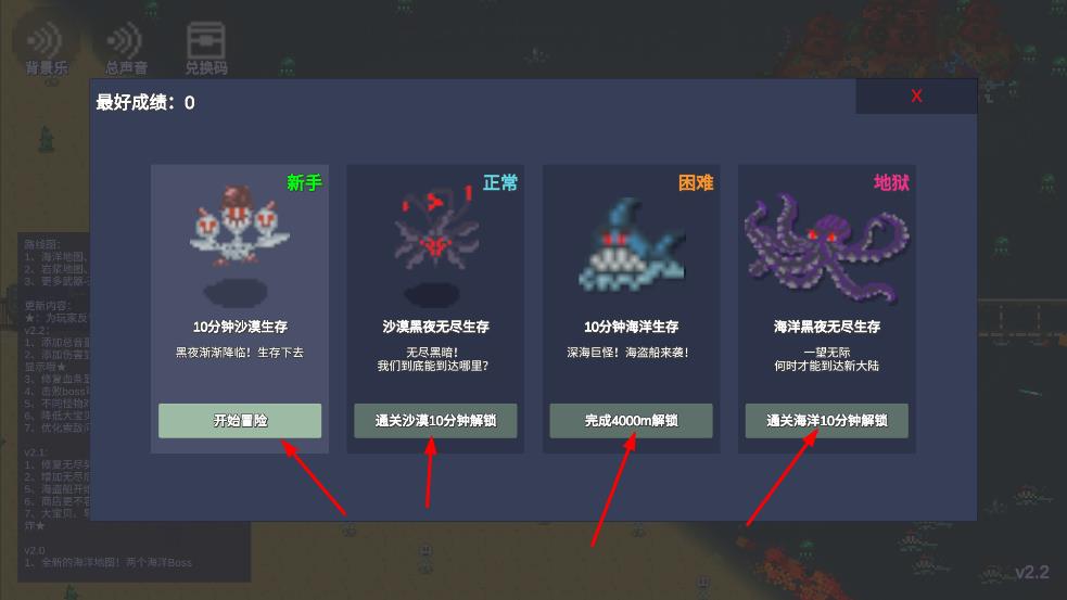 1、进入游戏界面,可选择新手10分钟沙漠生存等难度关卡,点击开始冒险开启,其他难度需完成对应任务解锁。