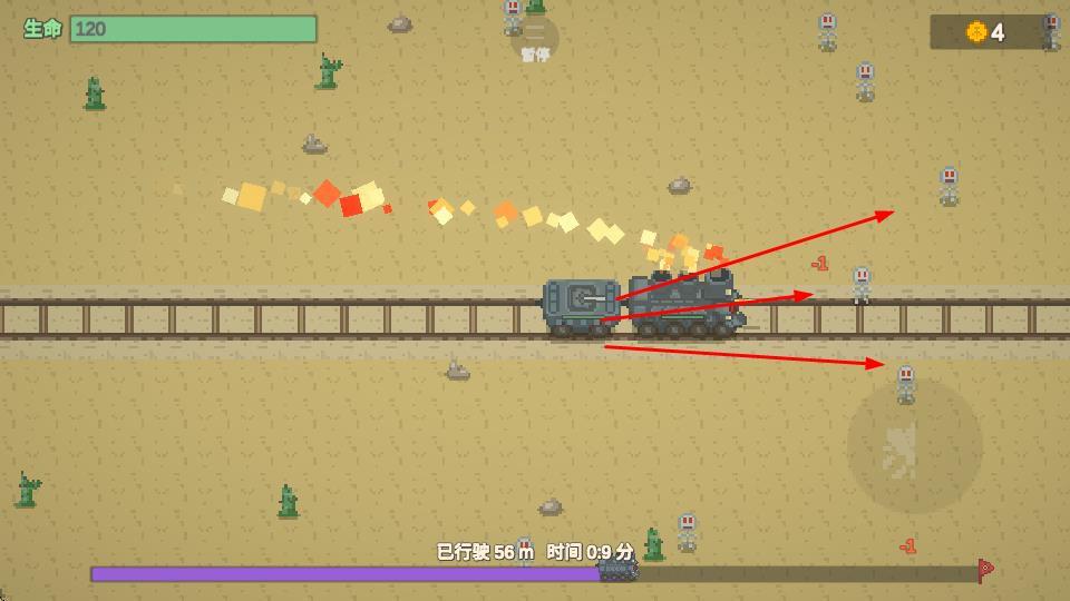 2、在沙漠场景中,操控火车行驶,发射攻击消灭铁轨旁的敌人,同时留意生命值与行驶距离,持续推进冒险进程。