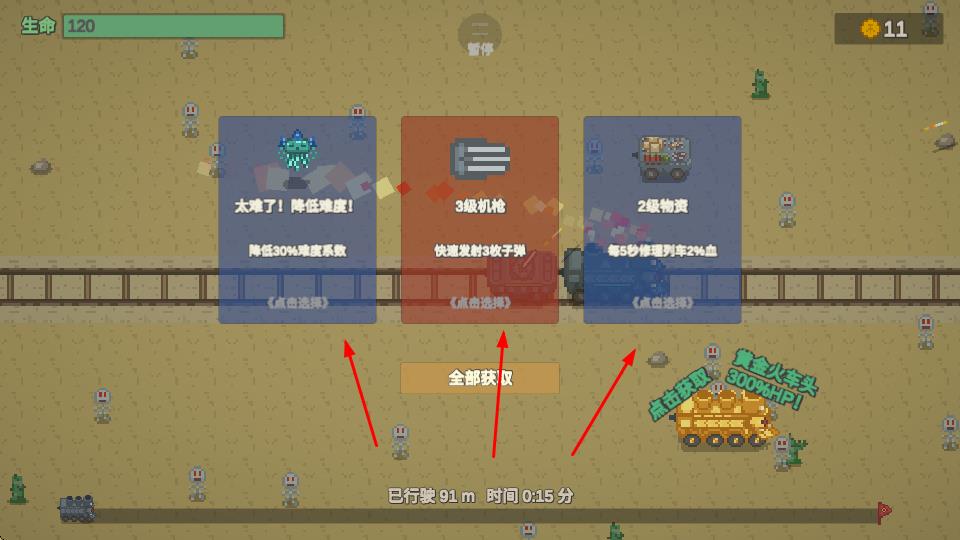 3、会出现增益选择界面,可挑选降低难度,3级机枪,2级物资等效果,助力火车生存与战斗。