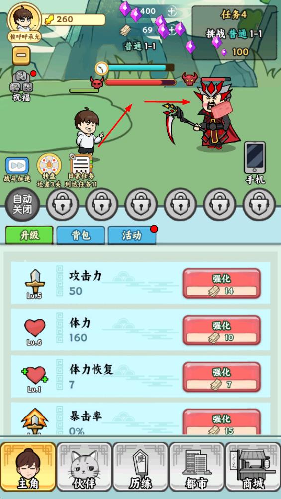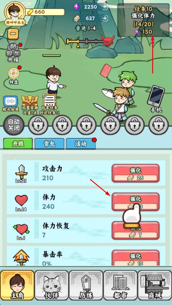 1、在升级界面,点击强化按钮提升攻击力、体力等属性,消耗对应道具或资源,增强角色战斗能力,为挑战关卡做准备。