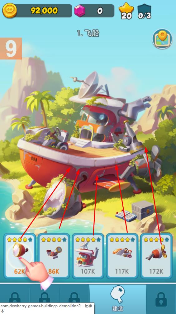 1、在飞船建造界面,花费对应金币解锁飞船部件,逐步组装飞船,提升飞船建造进度,解锁更多造型与功能。