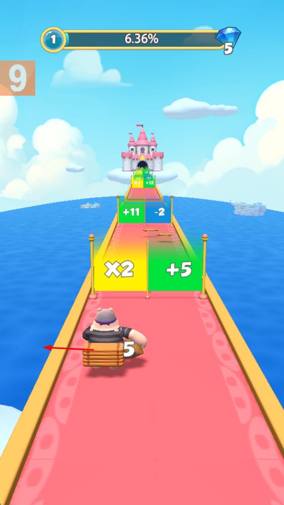 3、在跑酷关卡,操控角色在跑道上移动,选择带有×2+5等增益的区域,增加道具数量或得分,朝着终点城堡前进,提升关卡完成度。