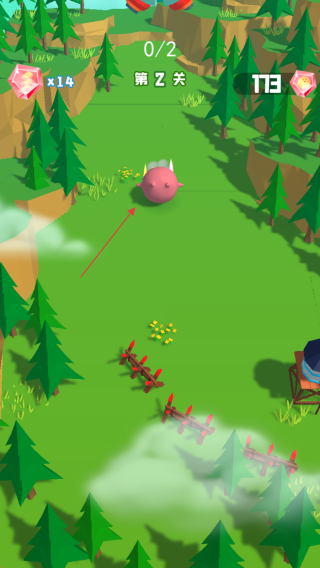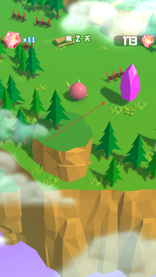 1、进入游戏查看左上角钻石数量和0/2的通关进度,第2关操控粉色滚动超人移动。