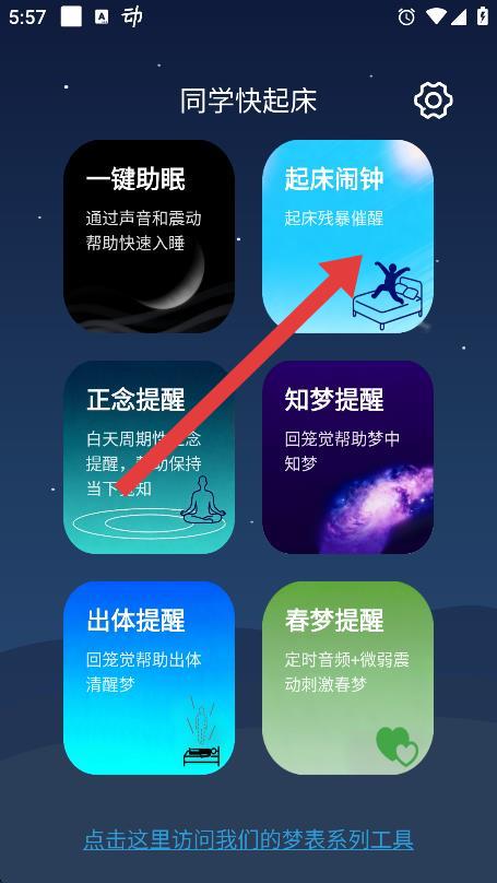 1、打开同学快起床app,点击起床闹钟选项。