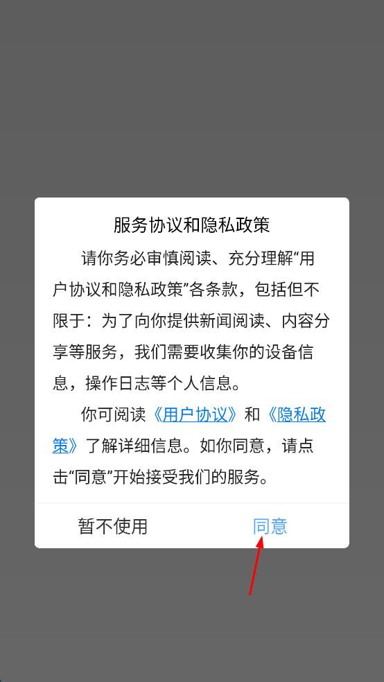 1、打开知工APP,出现服务协议和隐私政策弹窗,仔细阅读内容后,点击同意按钮。
