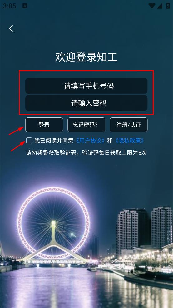 4、在登录界面,输入手机号码和密码,勾选我已阅读并同意用户协议和隐私政策,点击登录按钮。