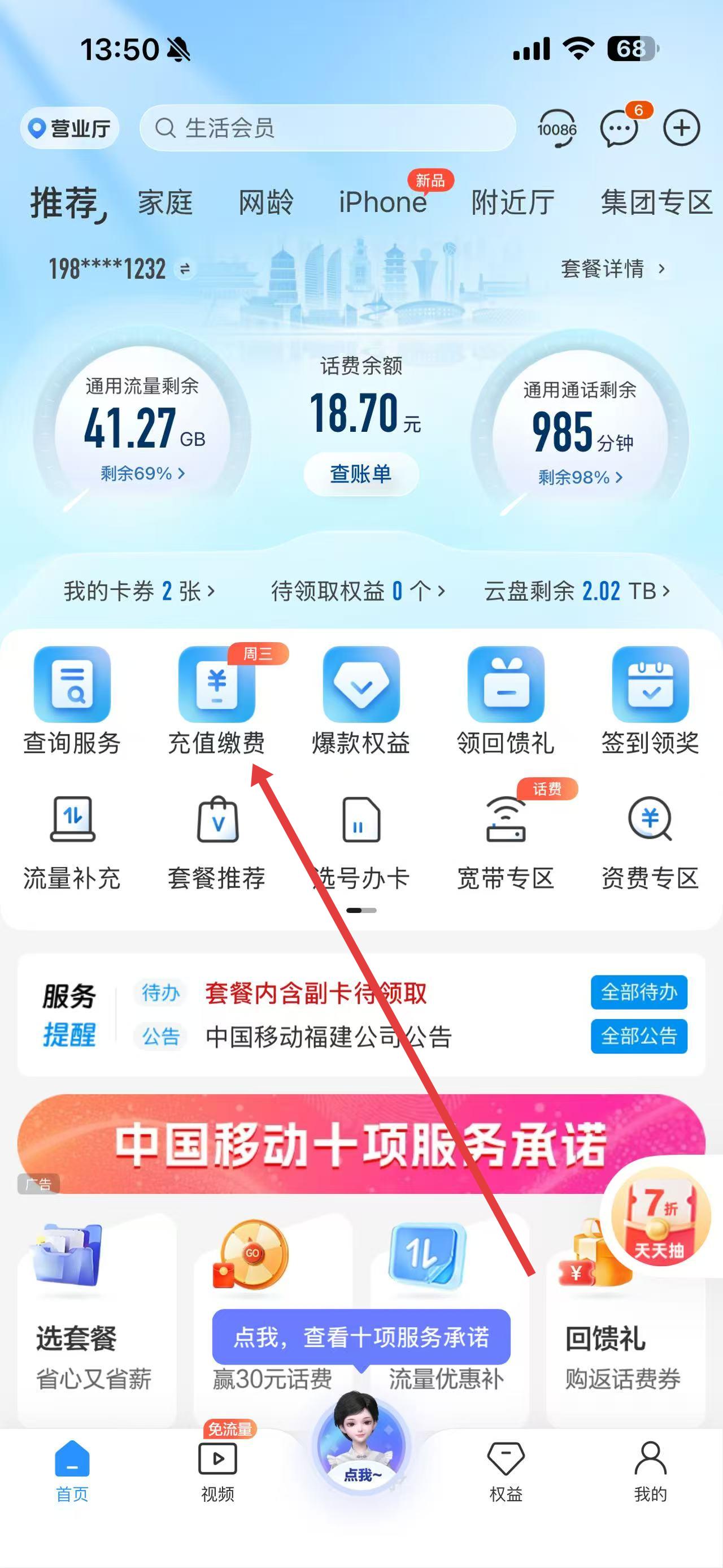 1、打开中国移动APP,在首页点击充值缴费图标进入充值中心。