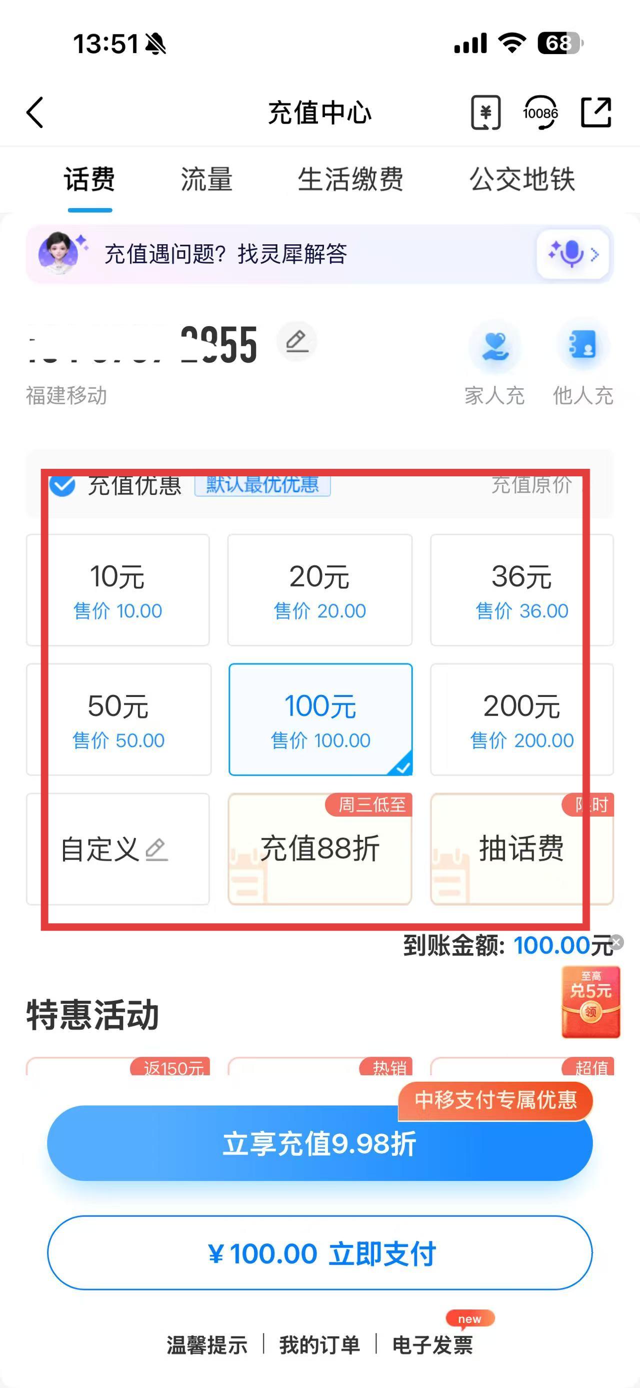 电子渠道专属充值优惠:充50送2元,充100送5元,最高可享91折优惠。