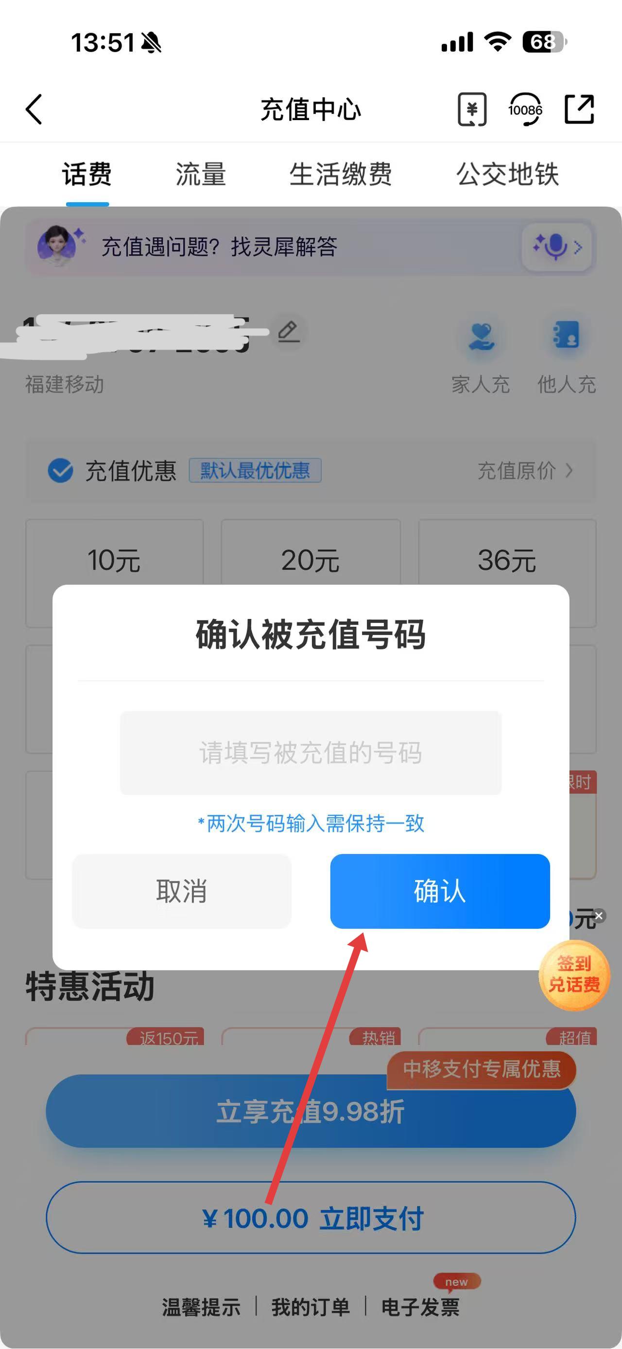 4、确认充值号码无误后,点击立即支付,按照提示完成支付流程,即可完成话费充值。