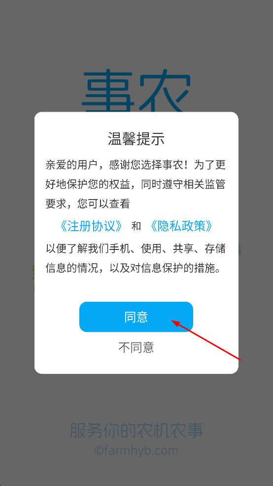 1、打开事农APP,会弹出温馨提示页面,仔细查看内容后,点击“同意”按钮,进入APP主界面。