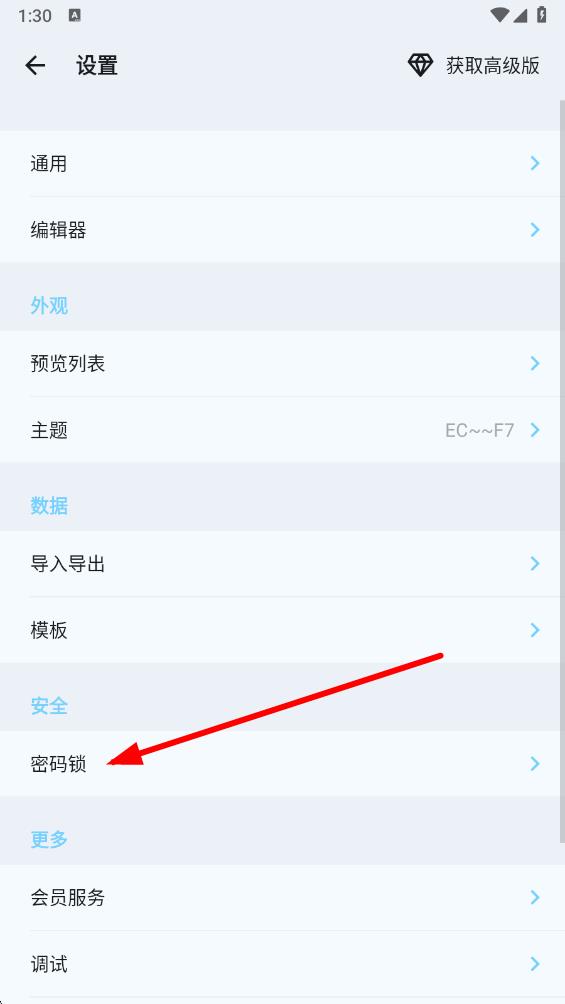 3、在设置界面里,向下滑动找到安全板块,点击其中的密码锁选项。