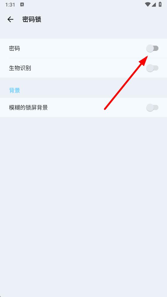 4、进入密码锁页面后,点击密码后的开关按钮。