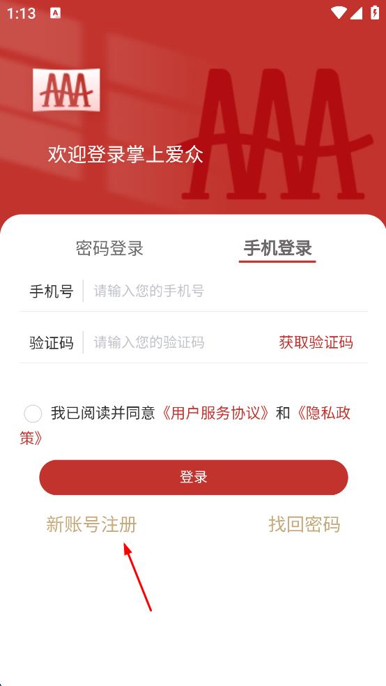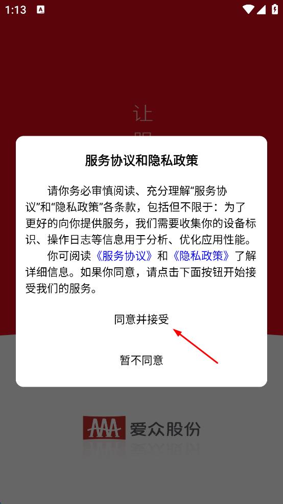 1、打开掌上爱众软件,会弹出服务协议和隐私政策页面,仔细查看内容后,点击“同意并接受”按钮,进入登录界面。