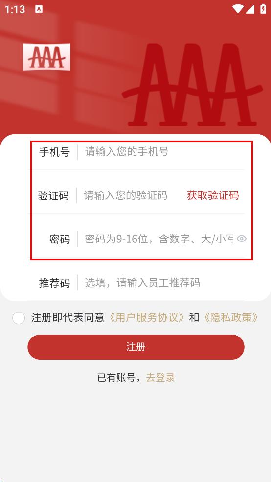 3、在注册页面,先输入手机号,接着点击“获取验证码”,在验证码输入框中输入收到的验证码,然后设置符合要求的密码。