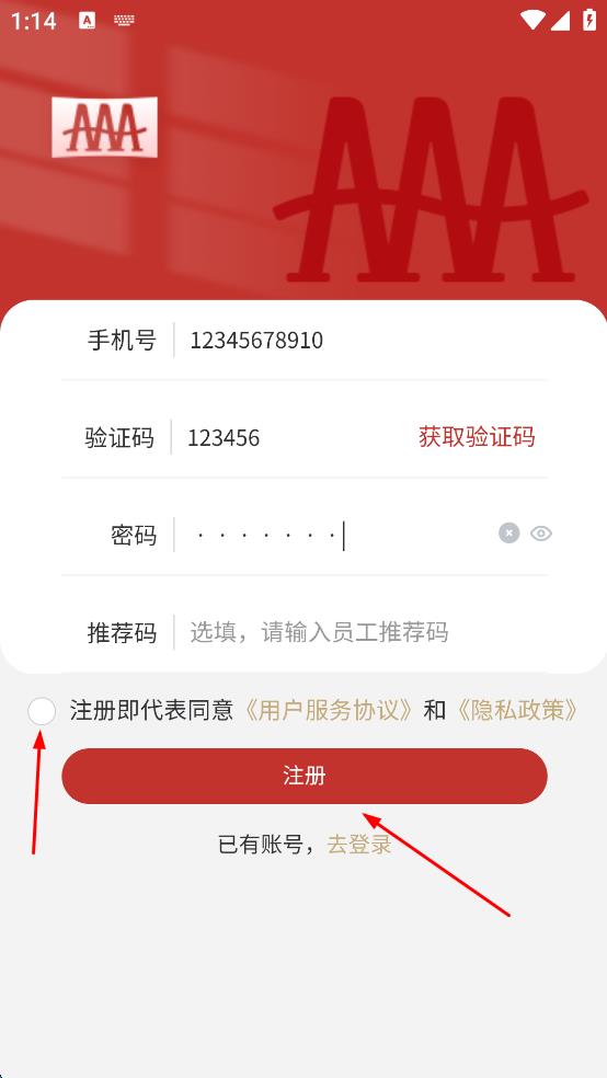 4、勾选“注册即代表同意用户服务协议和隐私政策,最后点击“注册”按钮,完成注册操作,之后可使用注册账号登录。