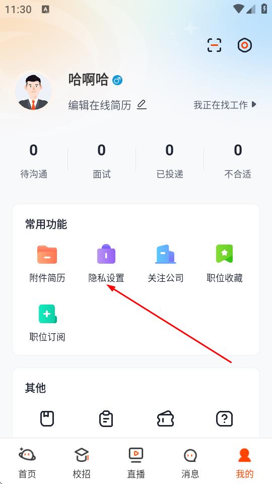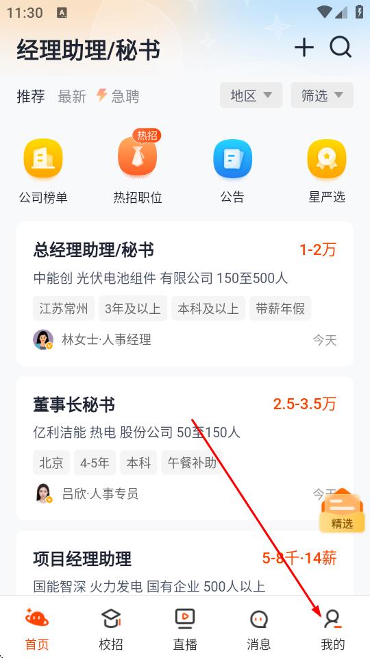 1、打开北极星招聘APP,点击底部导航栏中的我的。
