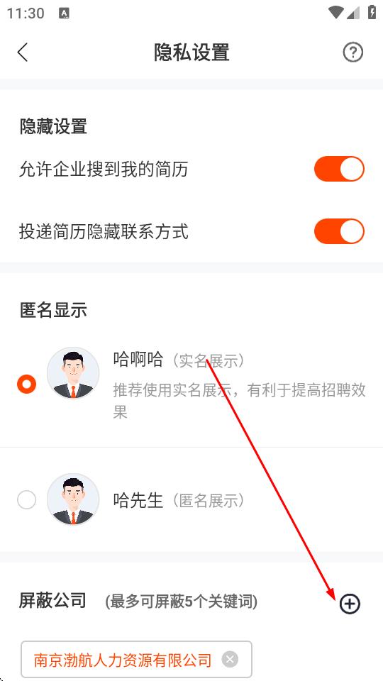 3、进入隐私设置页面后,下滑找到屏蔽公司选项,点击+号按钮。