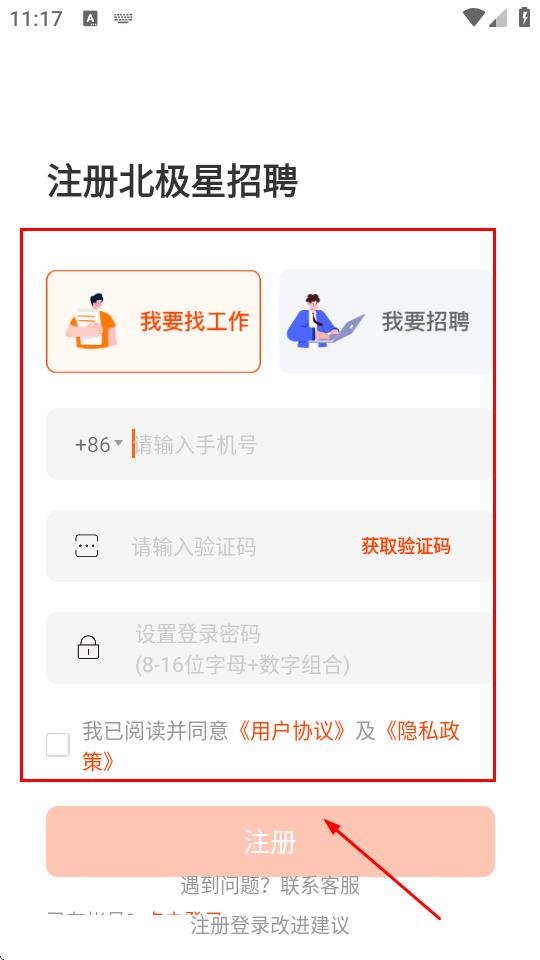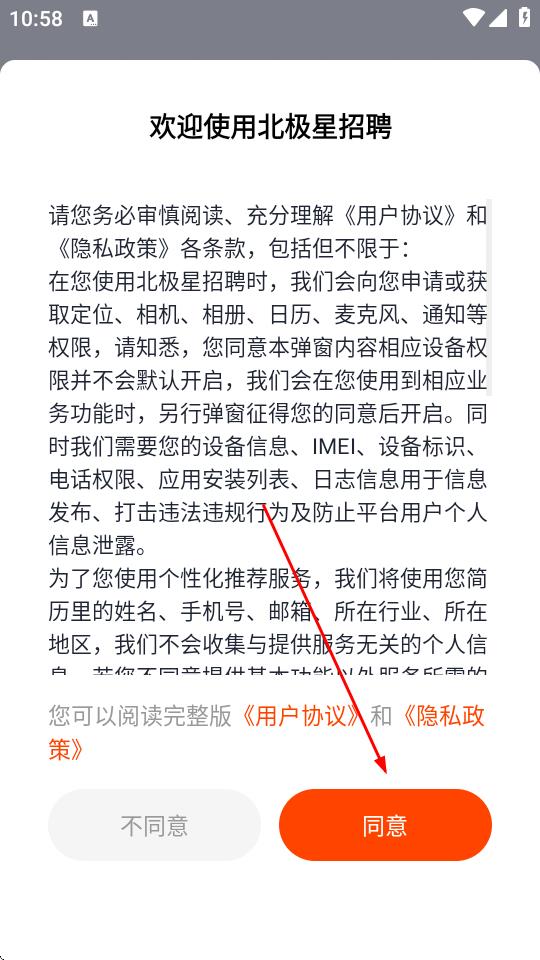 1、打开北极星招聘APP,在弹出的欢迎页面,点击同意按钮,接受用户协议和隐私政策。