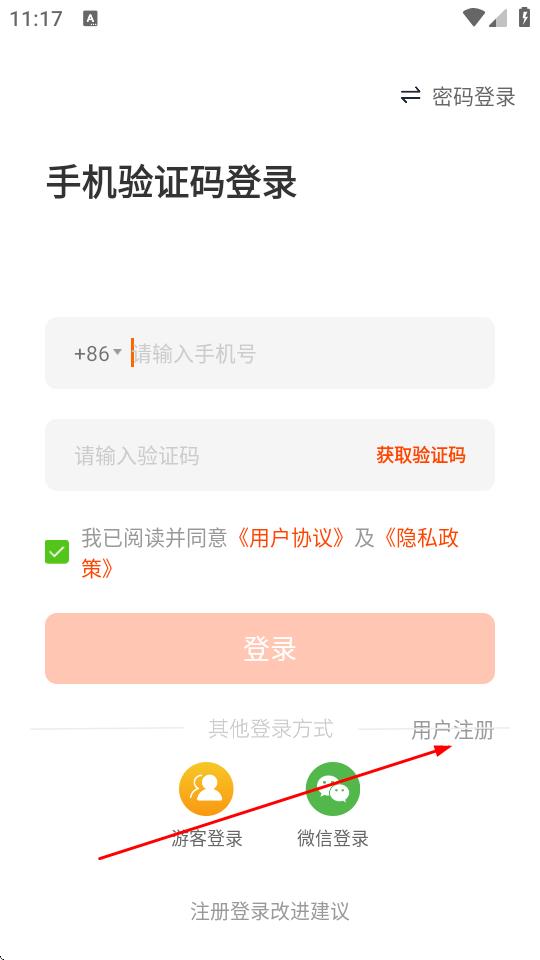 3、在注册页面,选择注册身份,输入手机号码,填入验证码,设置登录密码。
