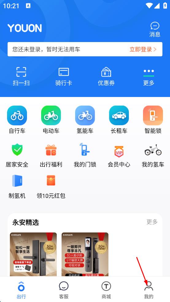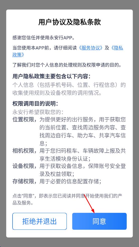 1、打开永安行APP,首先会看到“用户协议及隐私条款”页面,仔细阅读相关内容后,点击“同意”按钮,进入APP主界面。