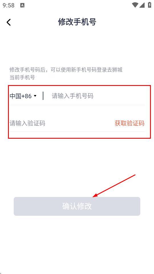 4、在修改手机号页面,输入新的手机号码,填入验证码,点击确认修改。
