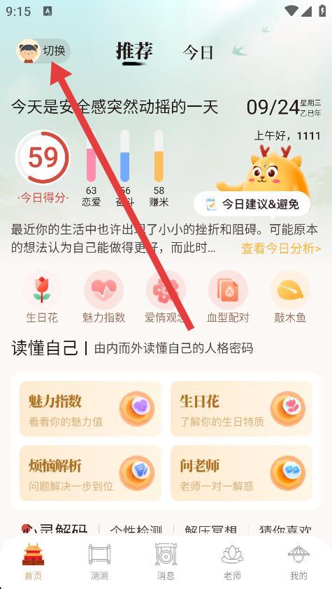 1、打开灵机算命,,点击左上角切换图标。