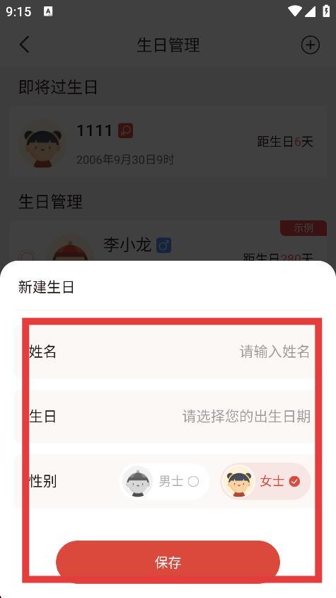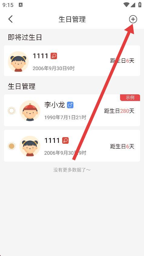 3、进入生日管理页面后,点击右上角的+图标。