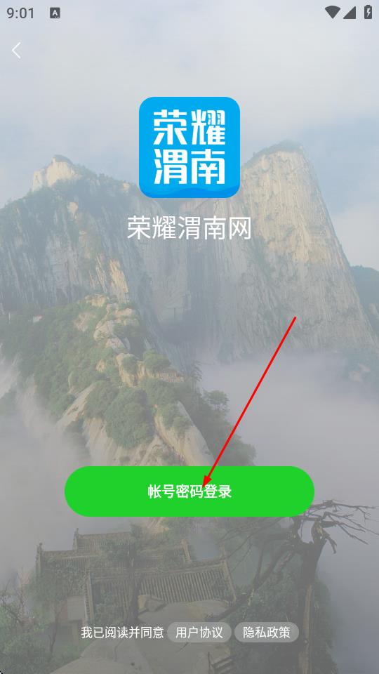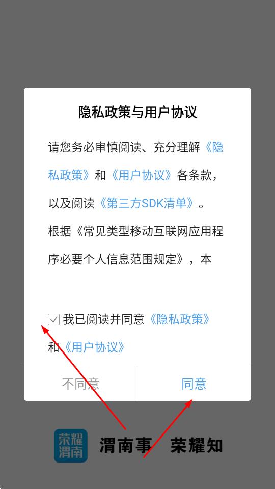 1、打开荣耀渭南网APP,在弹出的隐私政策与用户协议页面,勾选我已阅读并同意隐私政策和用户协议,点击同意。