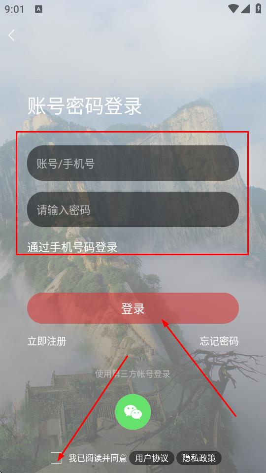 4、在账号密码登录页面,输入账号/手机号和密码,勾选我已阅读并同意用户协议隐私政策,点击登录,即可完成账号登录。
