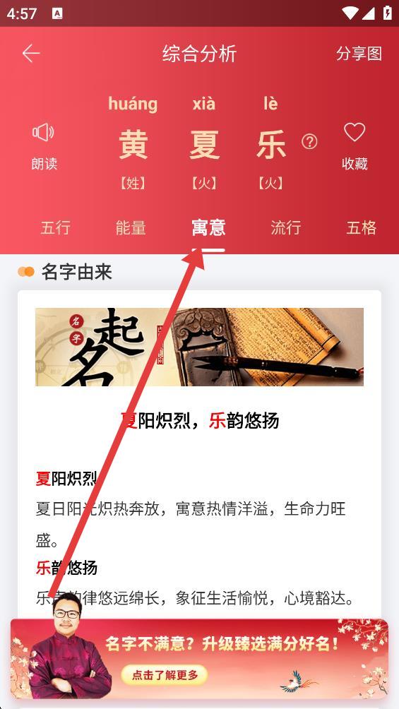 4、在名字详情页面,点击寓意解读板块,即可了解该名字的具体寓意。