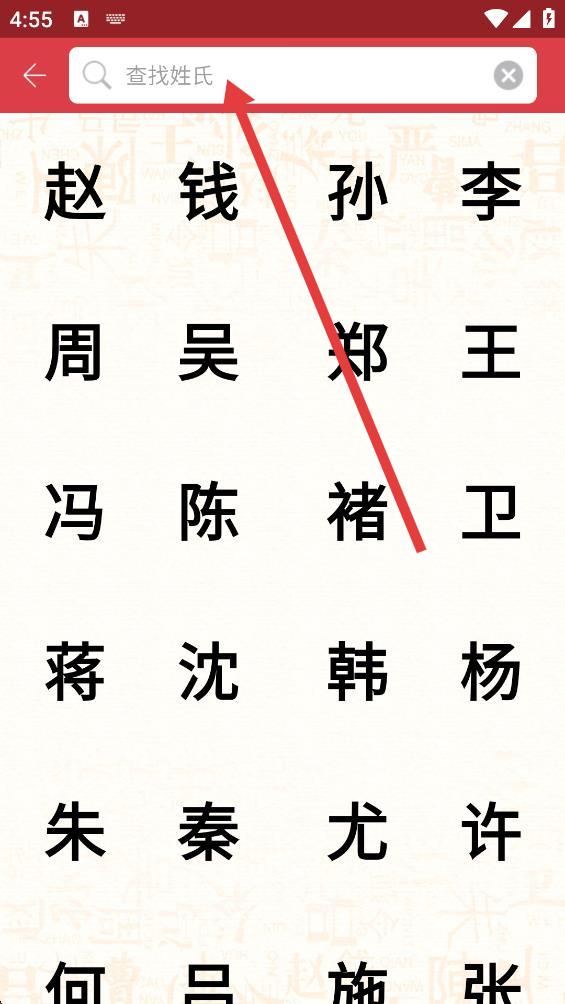 3、在百家姓氏页面,点击顶部搜索框,输入想要查找的姓氏。