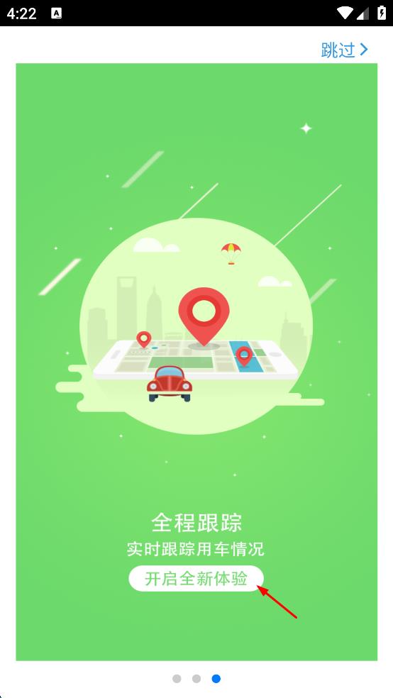 1、打开公务用车APP,会看到“全程跟踪 实时跟踪用车情况”的引导页面,点击“开启全新体验”按钮,进入APP主界面。