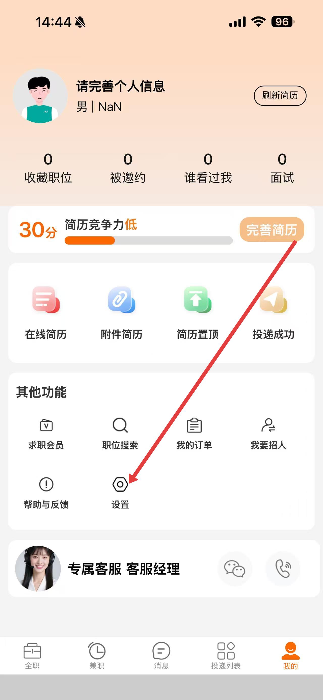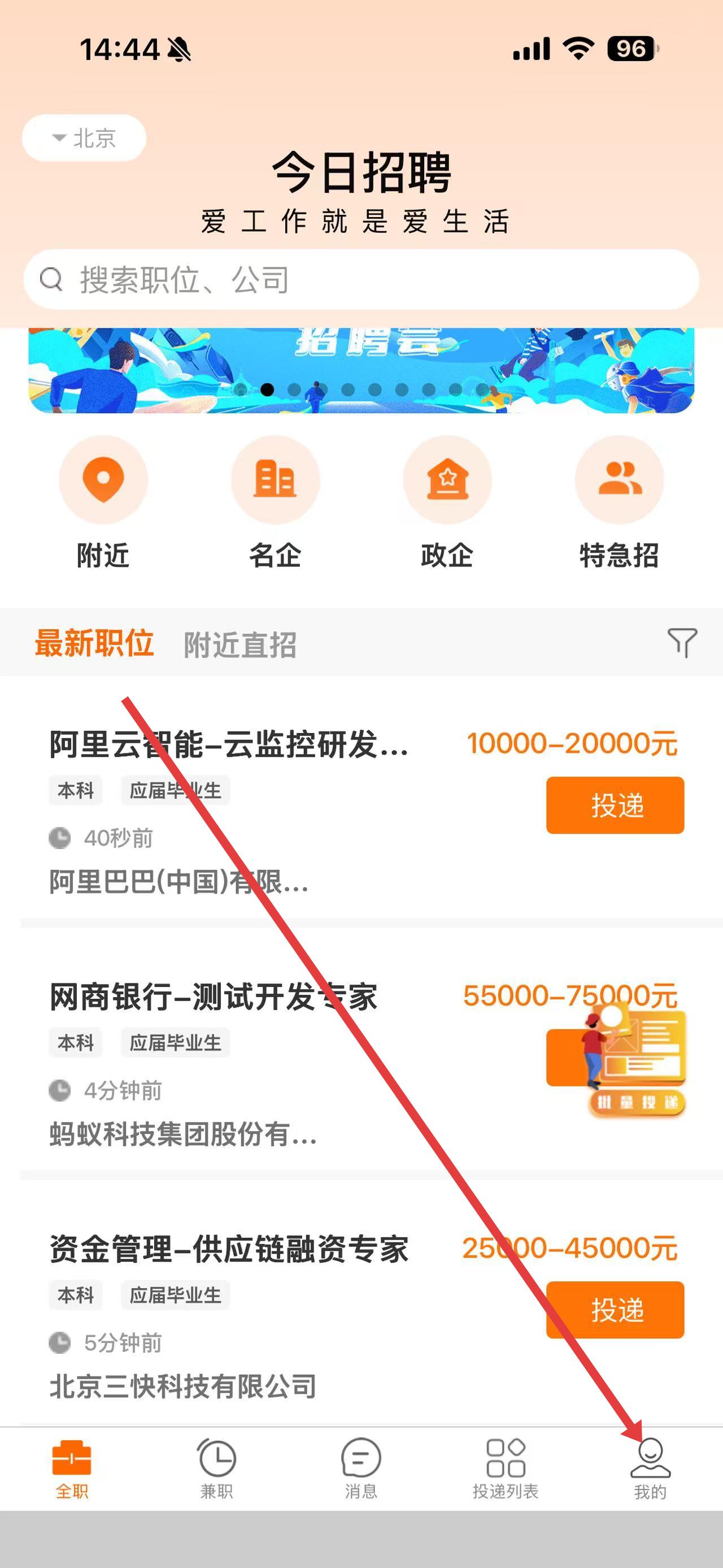 1、打开今日招聘app,点击底部导航栏最右侧我的进入个人页面。