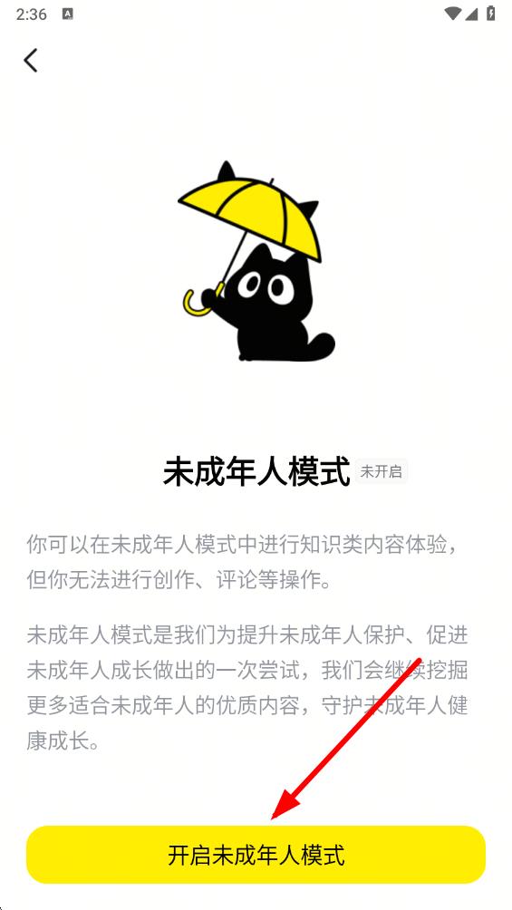 4、进入未成年人模式页面后,点击开启未成年人模式按钮,即可成功开启。