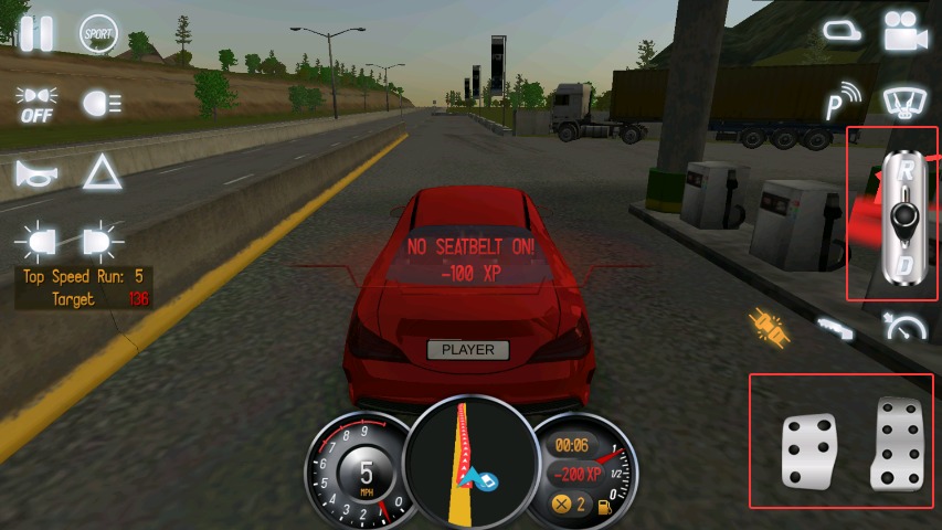 4、开起来之后,左手在屏幕左边划拉控制方向,右边几个键分别管加油、刹车和换挡,多开几次就习惯了。
