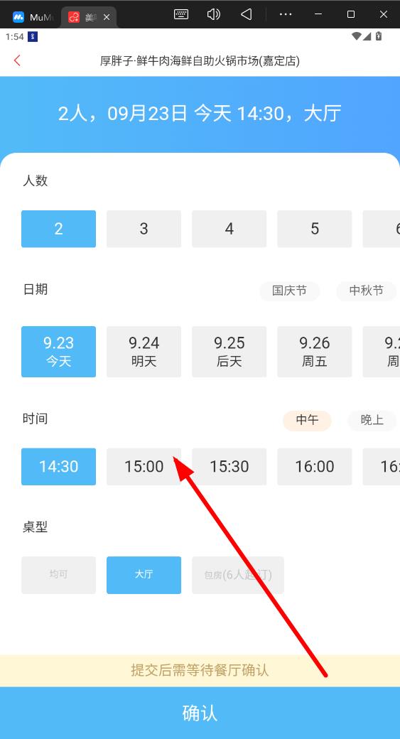 4、在预约页面选择就餐人数、日期、时间以及桌型等信息,确认后提交等待餐厅确认。