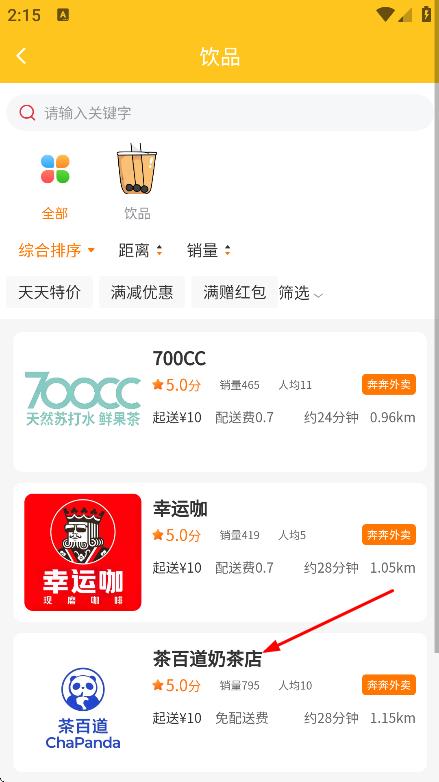 2、在饮品店列表页面,选择店铺,进入店铺页面。