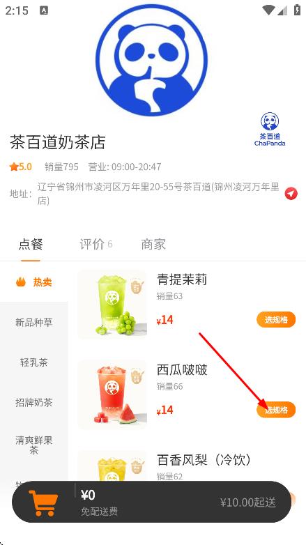 3、选择饮品,如点击西瓜啵啵旁的选规格,进入选择。