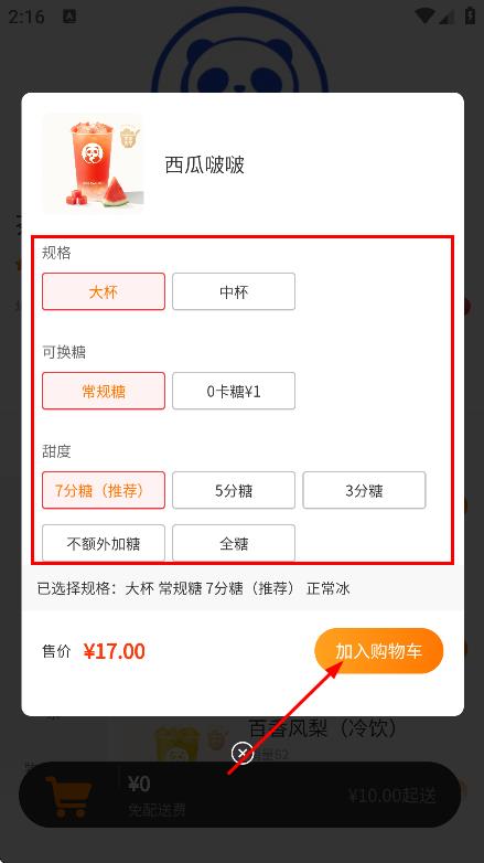 4、选好规格后,点击加入购物车,将饮品加入购物车。