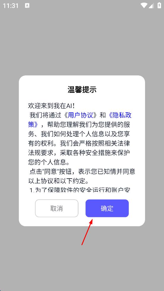 1、打开我在AI APP,会弹出温馨提示弹窗,仔细阅读相关内容后,点击“确定”,进入登录相关页面。