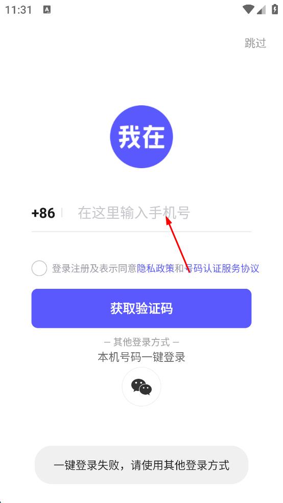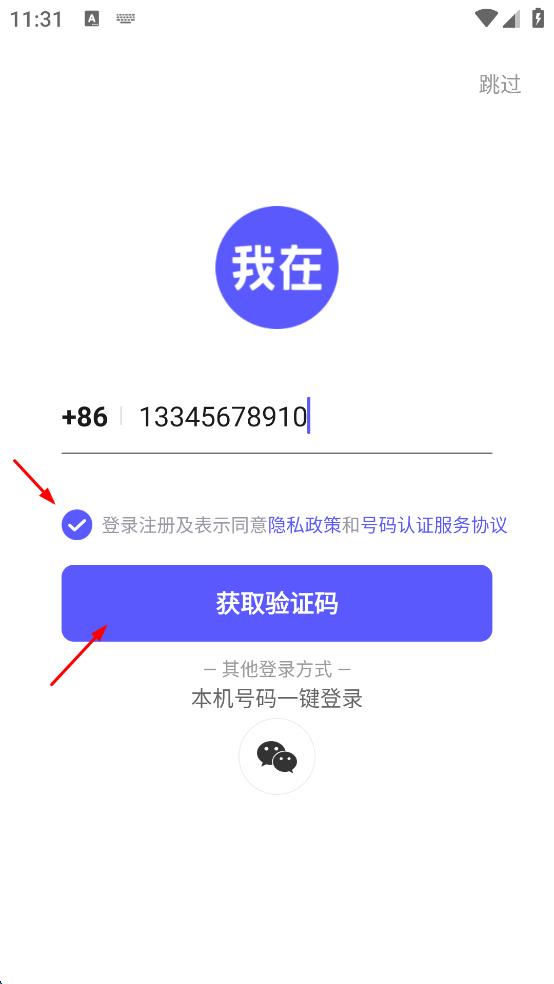 2、在登录页面,先在手机号输入栏输入手机号码,然后勾选“登录注册及表示同意隐私政策和号码认证服务协议”。